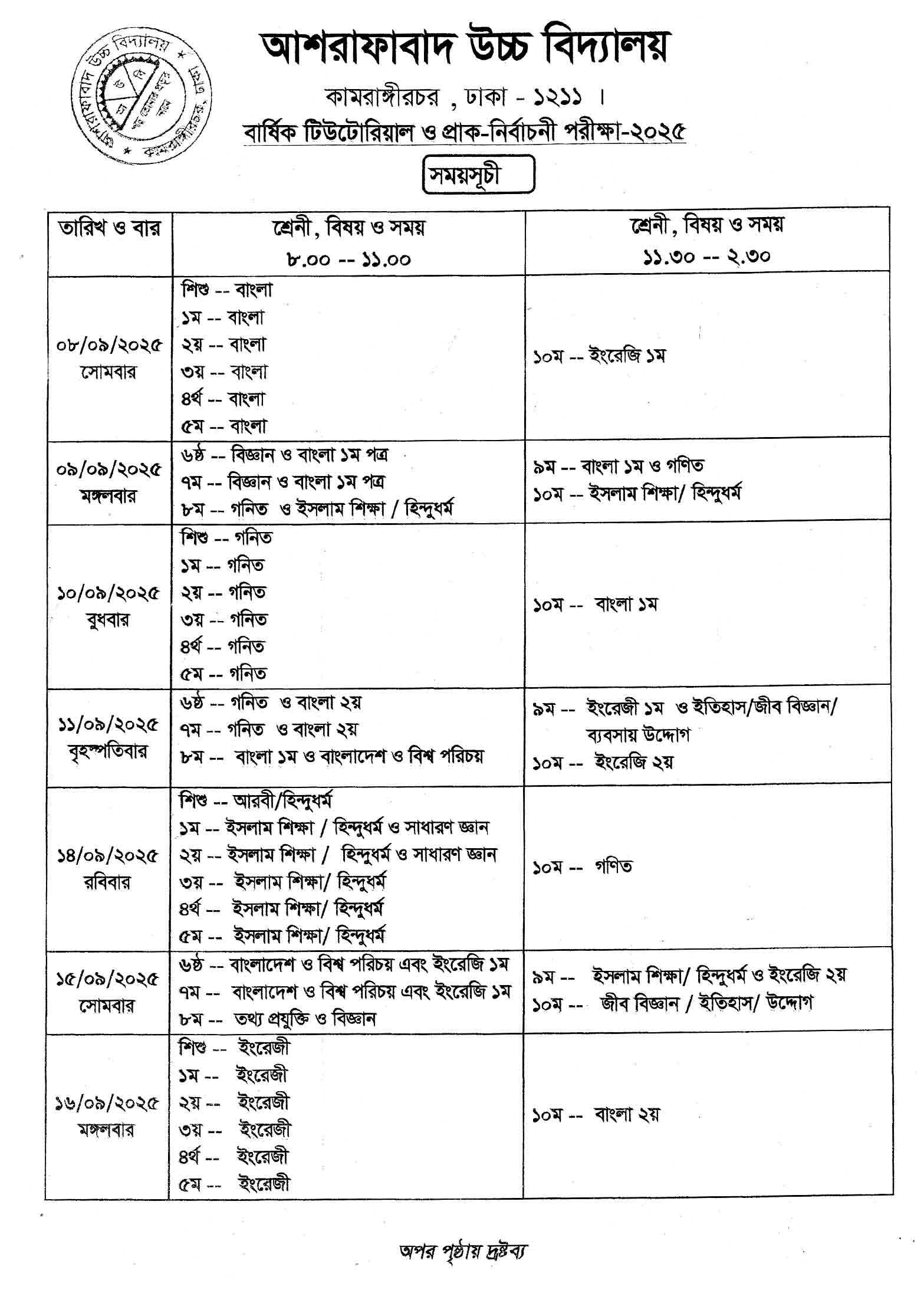 বার্ষিক টিউ. ও প্রাক-নির্বাচনী পরীক্ষার শুরুর সময়